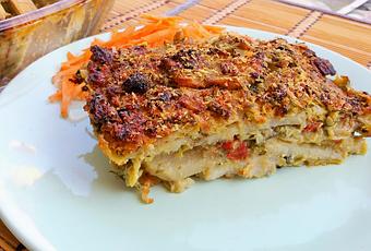 - Engrasamos un molde para el horno y vertemos toda la mezcla expandiéndola bien. Espolvoreamos la levadura de cerveza por encima y horneamos media hora a 180ºC en horno precalentado.