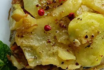 Ponemos un poco de aove en una sartén y dejamos que las patatas se pochen a fuego bajo durante 12 minutos. Apagamos ahora el fuego de la carne, pero la dejamos al calor residual. Sacamos, escurrimos y cubrimos el fondo de una fuente con la mitad de las patatas, las salpimentamos y vertemos la mezcla de verduras y carne, le picamos unas hojas de menta por encima y tapamos esto con el resto de las patatas, procurando que quede todo bien cubierto y salpimentamos. Todo está caliente, pero si necesita más calor… toque de microondas.Adornamos con unas hojas de menta y unas bolitas de pimienta rosa.