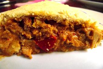Se forra todo el molde. Se agrega el relleno, se extiende la otra parte de la masa para cubrir el pie, se le hacen pequeños orificios y se lleva al horno por unos 40 minutos a fuego medio alto.