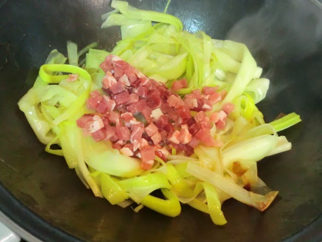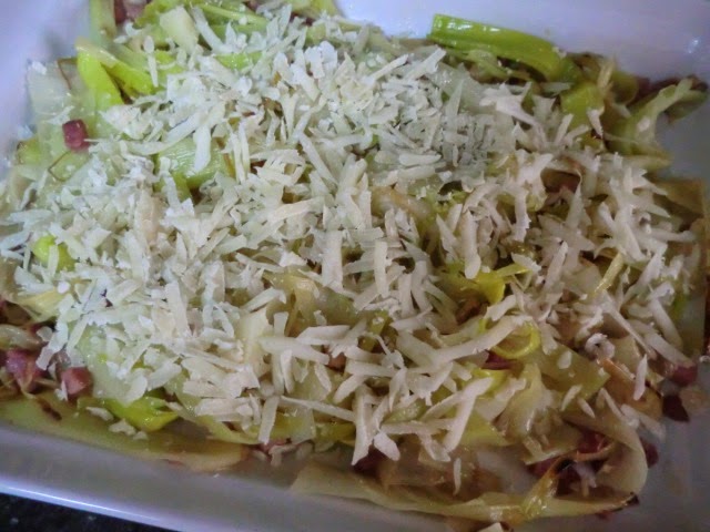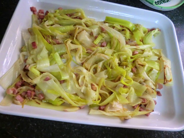 Añadimos el jamón y esperamos 5 minutos mas hasta que se dore. Apagamos el fuego y echamos los puerros con el jamón en una fuente resistente al horno.