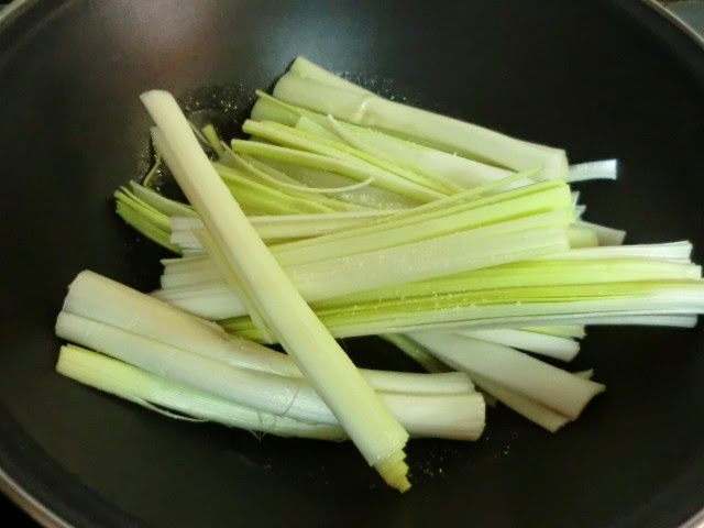 Comenzamos, cogemos los puerros y los lavamos bien, los cortamos en juliana. Ponemos una sarten al fuego con 4 cucharas de aceite, echamos los puerros y los dejamos pochar unos 20 minutos a fuego medio, moviendolos de vez en cuando para que no se quemen.