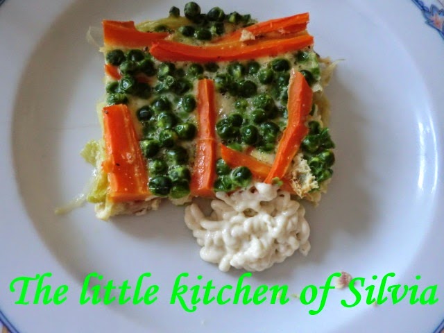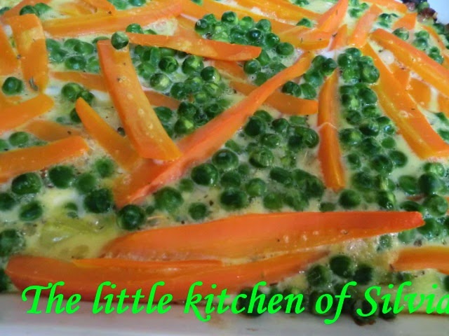 Rallamos el queso parmesano y lo echamos encima de los puerros, colocamos las zanahorias y los guisantes encima.