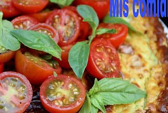 A la hora de servir partimos unos tomatitos cherrys y mezclamos con un poco de aceite de oliva virgen extra, sal, pimienta y unas hojas de albahaca y colocamos sobre nuestro delicioso pastel,