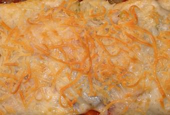El resto de las verduras y la salchicha triturada. Y por último cerramos con una capa de queso al romero:
