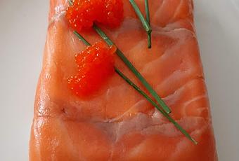 Retirar el film de la base y colocar la base del molde sobre la fuente en la que se vaya a servir. Retirar el molde y después el film. Añadir un toque de cebollino y huevas.