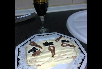Cogemos el pan del molde sin corteza y ponemos una fila de 8 rebanadas juntas, a continuación, ponemos una capa se salmón y tapamos con otras 8 rebanadas, en la otra capa ponemos, el sucedáneo a tiras y las gambas, y tapamos con otra capa de pan de molde, así sucesivamente, hasta alcanzar la altura que queráis.En la última capa se le añade mayonesa, una capa gruesa y bien extendida, para decorar, lo podéis decorar al gusto, o bien con anchoas y caviar, o bien con huevo duro y aceitunas.