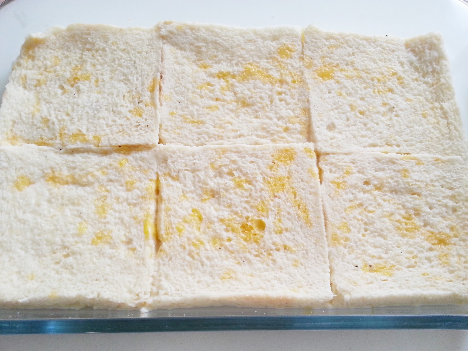 1. - Quitamos las corteza a las rebanadas y las untamos por un lado con la margarina, y la parte con la matequilla la pondremos tocando el fondo de la fuente.