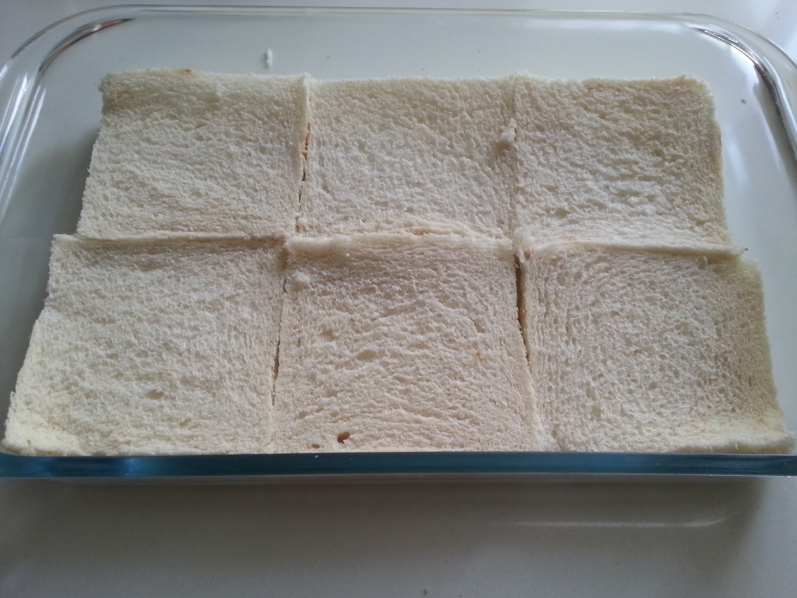 1. - Quitamos las corteza a las rebanadas y las untamos por un lado con la margarina, y la parte con la matequilla la pondremos tocando el fondo de la fuente.