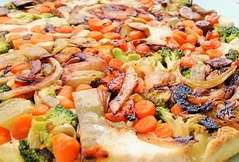 - Engrasamos un molde de silicona para el horno, colocamos las verduras en el fondo, las cubrimos con la pasta de tofu, aplastándolo con la cuchara.