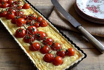 1- Precalentamos el horno a 180ºC. En un cuenco grande mezclamos la harina con la mantequilla hasta conseguir una textura similar a las migas. Añadimos la sal, el agua y seguimos mezclando. Sin amasar demasiado, extendemos la masa dando una forma similar al molde que vamos a utilizar. Extendemos la masa sobre este, pinchamos el fondo con ayuda de un tenedor para evitar que salgan burbujas. Colocamos encima un poco de papel de hornear, algunas legumbres que hagan peso y horneamos unos 20 min. Retiramos del horno, sacamos las legumbres y horneamos 15 min. más, que quede casi hecho.2- Batimos los huevos con la nata y la leche. Añadimos las especias, la sal y la pimienta al gusto. Chafamos el queso feta con ayuda de un tenedor.3- Sacamos el horno el molde con la masa, extendemos sobre la base del pastel el queso feta, encima los huevos batidos y sobre estos colocamos los tomates a nuestro gusto. Horneamos unos 20 min o hasta que comience a dorarse. Dejamos enfriar sobre una rejilla con cuidado de no romperlo y servimos.
