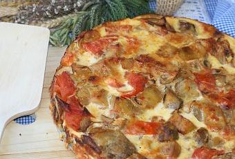 9- Ponemos en el molde la base de pan rallado.10 - Añadimos las verduras y le incorporamos los huevos batidos.