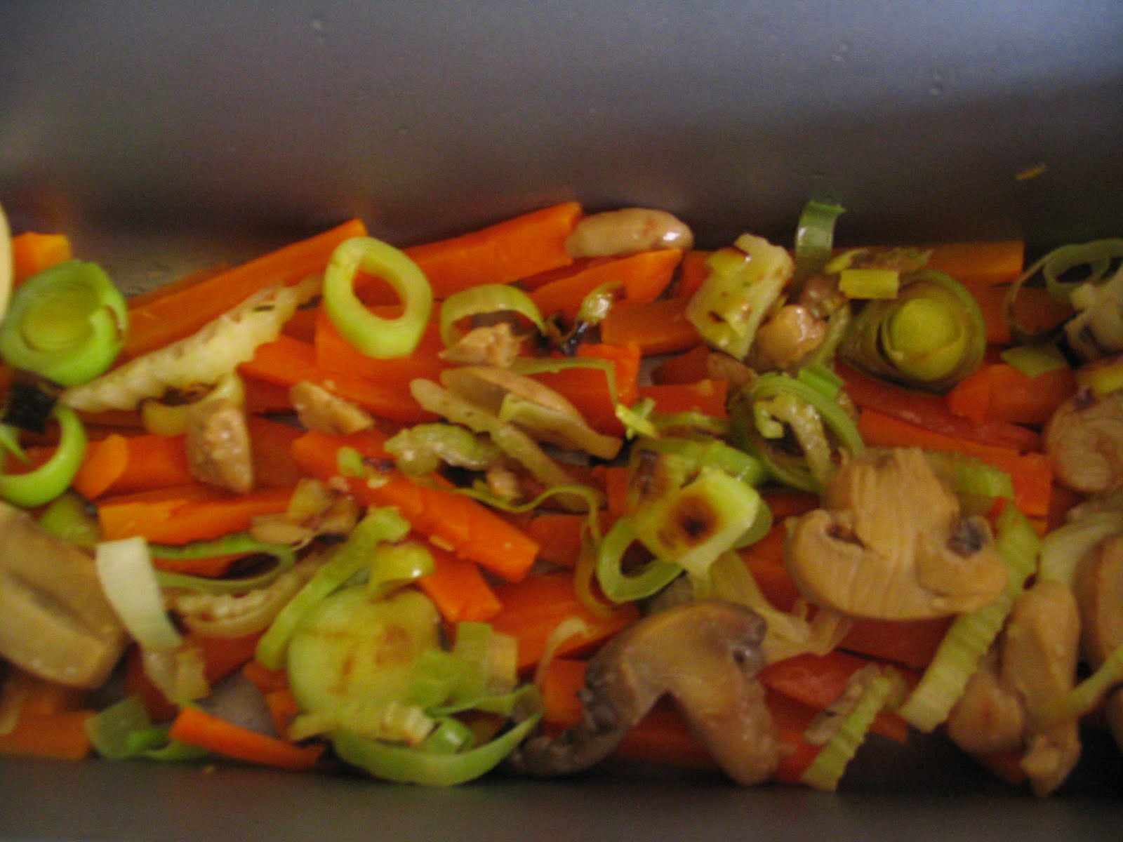 Ingredientes: 400 gr de zanahorias; 400 gr de calabacín; una lata de champiñones laminados, 85 gramos escurridos; 2 latas de atún pequeñas (de las que vienen en paquetes de 3), 1 en aceite de oliva y otra al natural, escurridas; 1 apio; 1 puerro; sal; 2 hojas de laurel; ajo en polvo; 4 huevos; aceite de oliva; 1 bote de crema de soja o nata de soja para cocinar de 250 gramos.
