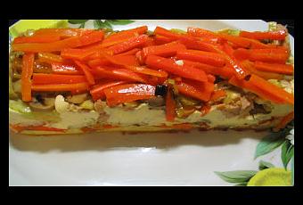 Montaje: en el fondo del molde ponemos la crema que hemos preparado, seguida de una capa de zanahorias. Encima, los champiñones, el apio y el puerro dorados. Luego, calabacín, una lata de atún pequeño en aceite de oliva escurrido, otra de atún pequeño al natural y cubrimos con la crema. Damos unos golpitos para que se impregne todo bien. A continuación, capa de calabacín, otra de apio, champiñón y puerro dorados. La última de zanahorias y cubrimos con la crema restante. Volvemos a dar golpes para que se reparta bien la crema.