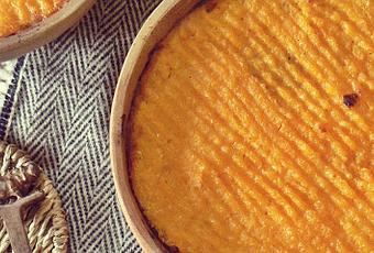 Llegó la hora de armar el plato. Para ello, disponemos el relleno en cazuelas, humedecidas con rocío vegetal (pueden enmantecarlas o pincelarlas con aceite, si así lo prefieren) y cubrimos con el puré de calabaza que hemos preparado. Si tenemos ganas, con un tenedor, le hacemos un dibujo a la cubierta de los pasteles y los llevamos a hornear en horno fuerte hasta que se doren y gratinen ligeramente.