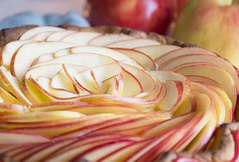 Mientras se hornea la base, haremos la crema pastelera como hemos indicado un poco más arriba. Una vez tengamos la base horneada verteremos nuestro relleno de crema pastelera. Ahora tenemos que cubrir con manzanas Ambrosia, nosotras hemos optado por cortar dos manzanas por la mitad, y luego en rodajas muy muy finitas, lo más que podais. De esta manera serán más flexibles y no se nos romperán. Dibuja una espiral con las manzanas hasta llegar al centro. Y listo!