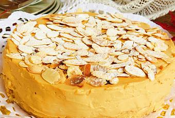 Se trata de un pastel fresco, elaborado con mascarpone y dulce de leche , para decorar unas almendras laminadas que le aportan el toque crujiente.