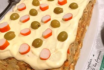 Desmoldar, cubrir la parte superior con mayonesa y decorar al gusto con las aceitunas y los palitos de surimi reservados.