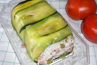 - Rellenamos con la ensalada de arroz y cerramos el molde con el calabacín.