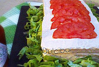 Tengo que pedir disculpas por la calidad de la foto... pero, como os comenté ayer, la preparé para una cenita este verano y, en ese momento, no tenía la cámara a mano y la hice con el móvil, pero os aseguro que está muchísimo más rico de lo que se aprecia en ella! Para este pastel frío necesitaremos (podéis aumentar la cantidad de cada ingrediente según el tamaño que queráis preparar):INGREDIENTES:- 6 rebanadas de pan de molde sin corteza- 2 latitas de atún- Medio bote de tomate triturado- 5 cucharadas de mayonesa- 3 cucharadas de ketchup- Tabasco original- Sal- Decoración: Tomate natural y lechugaPREPARACIÓN:- Yo utilicé pan de molde normal (con rebanada grande), así que lo primero fue quitar la corteza (se puede dejar, pero así queda más "fino"). - Preparar la salsa: mezclar la mayonesa con el ketchup y unas gotas de Tabasco original al gusto.- Para preparar el pastel, colocar dos rebanadas de pan, una al lado de la otra, bien juntas.- Encima, poner una capa de tomate extendiéndola bien por la superficie y salar.- Escurrir el atún y añadir el contenido de una de las latas bien esparcido. - Extender un par de cucharadas de la salsa.- Repetir el proceso: capa de pan, tomate, atún y salsa.- Terminar con una capa de pan de molde.- Untar bien toda la superficie del pastel con la salsa sobrante.- Si es posible, dejar reposar un rato en la nevera (puede dejarse preparado, incluso, de un día para otro).- Decorar como se desee, en este caso con rodajas de tomate natural y lechuga cortada en juliana. - Nota: Si os gusta con más salsa podéis aumentar las cantidades. Con las que he puesto da para cubrir el pastel pero no en exceso porque a nosotros en casa nos gusta así para que no se apodere al resto de sabores.Rápido y fresco y con un toque picante que le va fenomenal! Os ha gustado?Un abrazo!
