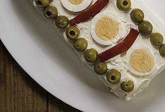 Unmold the cake and cover with more mayonnaise. Decorate it with the hard-boiled egg, the olives and the red pepper.
