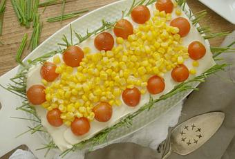 - Decoramos con el cebollino por los laterales, los tomates partidos a la mitad y un poco de maíz por encima.