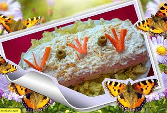Esta receta tan refrescante la solía hacer mi queridísima yaya como nosotros la llamábamos en casa cariñosamente. Y como la hacíamos enfadar INGREDIENTES PARA 6 COMENSALES:500 gr de medallones de merluza sin espina500 de colas de rape300 gr de langostinos cocidos½ paquete de surimi2 cogollosAceitunas rellenasUn botecito de alcaparras2 latas de atún al naturalMahonesa2 huevos cocidosELABORACIÓN:Primero de todo vamos a hervir la merluza y el rape en una olla durante unos 20 minutos aproximadamente .Mientras tanto vamos limpiando los cogollos y los cortaremos en juliana, la añadiremos en un bol y vamos a por el pescado que ya lo tendremos hervido y lo escurriremos dejando que se enfrie totalmente. Mientras tanto pelaremos los langostinos y los cortaremos a trocitos y los mezclaremos con los cogollos que tenemos ya reservados. Añadiremos también el bote de alcaparras escurridas, las olivas troceadas, el surimi cortado a trocitos no muy grandes y las dos latas de atún escurridas. Añadimos una cucharada de mahonesa y mezclamos bien. Reservamos y vamos a desmenuzar el pescado que este total mente frio, lo desmenuzamos en un bol y le añadimos dos cucharadas de mahonesa y con un tenedor lo vamos aplastando y mezclando bien y reservamos en una fuente de cristal alargada y honda, la forramos de papel film para cuando vayamos a decorar el pastel le podamos dar la vuelta fácilmente. Primero de todo añadimos con una cuchara una capa de la mezcla de merluza y rape ni muy gorda ni muy fina que este bien, luego una capa de la mezcla de cogollos que hemos reservado previamente. Pelamos los huevos cocidos y ponemos un huevo laminado encima de la capa del relleno de los cogollos, otra de pescado y así sucesivamente hasta que la última sea de pescado. Por último con una espátula presionamos bien y cubrimos con el resto de papel film y lo introducimos en la nevera unos 20 minutos .Pasado los 20 minutos lo sacamos de la nevera y abrimos el papel.Film que hemos puesto encima y en una bandeja con mucho cuidado le damos la vuelta y retiramos el resto del papel y a hora lo decoraremos al gusto extendemos por encima mahonesa y rallaremos un huevo por encima pondremos Palitos de surimi y unas olivas.