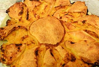 Pon la otra lamina encima y con un tenedor puntea el centro donde esta el relleno, y sella el filo. Con un cuchillo afilado haz cortes en las dos láminas como si fueran flecos grandes. Y con cuidado gira cada "fleco". ( Fíjate en la foto)Hornea 20 min 180º