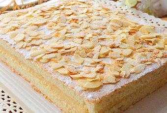 120 gr. de almendra en polvo125 gr. de azúcar4 claras de huevosal3 c/s de almendras laminadas2 c/s de azúcar lustre o glas100 cc. de agua50 gr. de azúcar100 gr. de mantequilla75 gr. de azúcar75 gr. de avellanasDejar la mantequilla a temperatura ambiente para que se ablande.Mezclar la almendra en polvo y 100 gr. de azúcar.Montar las claras a punto de nieve con una pizca de sal, a medio montar añadir25 gr. de azúcar y seguir hasta que se formen picos en las claras ya montadas.Mezclar las claras con la mezcla de harinas y azúcar con movimientos envolventes para que la masa resultante quede airosa.Forrar un molde rectangular grande con papel sulfurizado, verter la mezcla y alisar con una espátula. Ha de quedar una capa tirando a fina de masa.Hornear en horno precalentado a 180 º durante unos 10-12 minutos.Para saber si está basta con introducir una brocheta en la masa, si sale limpia estará listo.Dejar enfriar.: prepararlojuntando 100 cc. de agua con 50gr. de azúcar y poner en el microondas un par de minutos o hasta que el azúcar esté disuelto. Dejar enfriar y reservar.: hacer un almíbar con 75 cc. de agua y los 75 gr. de azúcar, poner a fuego medio, y sin remover, dejar que hierva suave unos 5 minutos., ha de quedar un almíbar a punto de hebra.Batir la mantequilla blanda hasta que quede como una pomada, ir añadiendo poco a poco el almíbar y sin dejar de batir o remover.Añadir las avellanas que previamente se habrán triturado dejándolas muy finas, segur batiendo hasta obtener una cremahomogénea.Dejar enfriar.: dividir la plancha de bizcocho en dos partes iguales,pintar toda la superficie con el almíbar reservado, sobre una de ellas repartir el relleno (la crema de mantequilla de avellanas), colocar encima la otra mitad de la plancha, que la parte almibarada esté en contacto con el relleno.Sobre la superficie del pastel repartir azúcar glas cubriendo todo,repartir por encima las almendras fileteadas que habremos tostado en una sartén sin nada de aceite.Si los bordes no quedan parejos, se recortan un poco para que estén bien definidos. Almendra en polvo o harina de almendra, no es más que las almendras muytrituradas.** El molde o bandeja para hacer el bizcocho que sea de buen tamaño, el mío hace unos 35 x 25aprox.** Punto de hebra es cuando cogiendo una pequeña cantidad de almíbar (coger primero con una cuchara)entre los dedos mojados en agua fría, se juntan estos y luego se separany se forma un fino hilo de almíbar entre ellos.**La mantequilla se puede batir con unas varillas o con un robot.** El azúcar glas se puede repartir bien si se emplea un colador y se dan golpecitos para que este quede tamizado.** Las almendras fileteadas se tuestan enseguida, así que hay que andar al caso que no se os quemen.** c/s = cuchara sopera