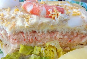 Forrar una fuente con films transparente y colocar una de las láminas de pan, cubrir con el relleno de palitos de surimi, langostinos y salsa rosa.