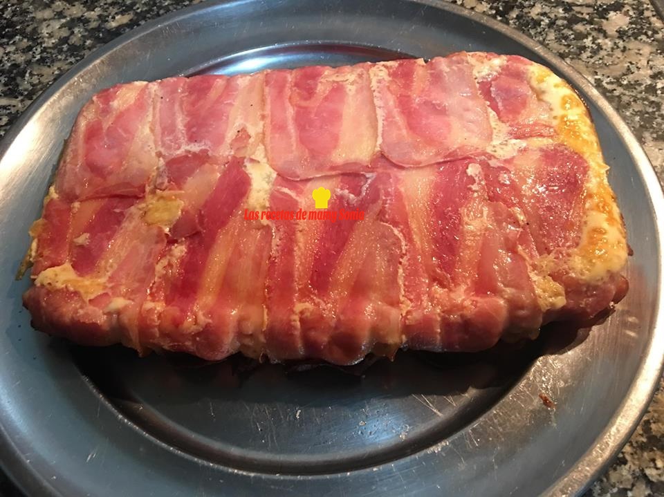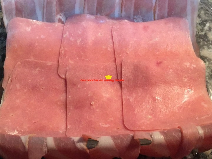 Cerramos el pastel con las tiras de bacon de los lados.( mis lochas eran pequeñas y como no cubría totalmente el pastel puse lonchas de jamón)