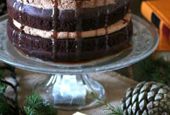 Para montar el pastel colocamos una primera capa de bizcocho y extendemos una generosa capa de crema de chocolate y así sucesivamente dejando la parte superior y los lados sin cubrir. Refrigeramos.