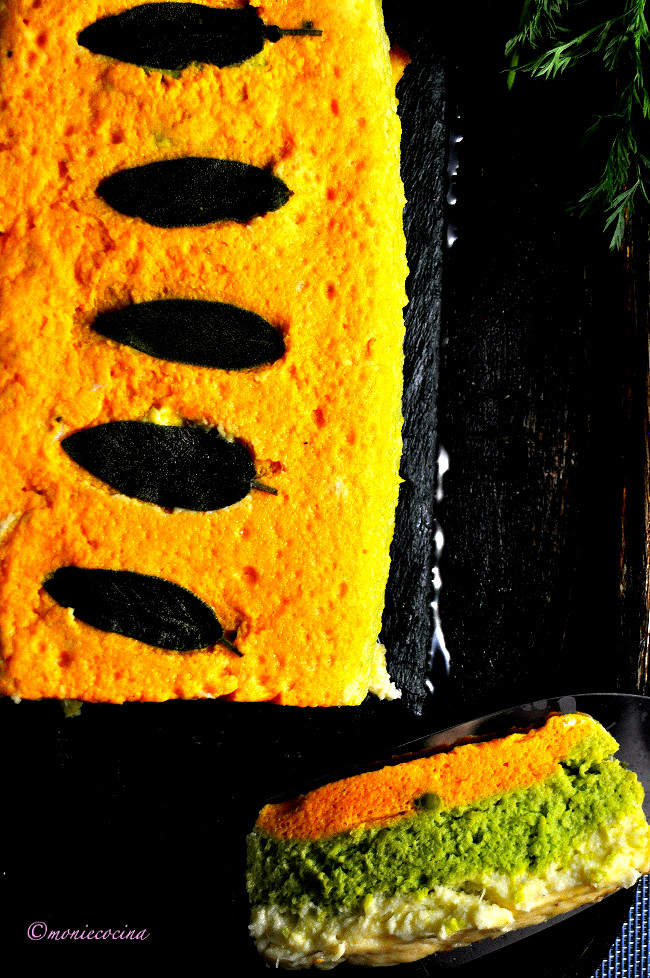 - Untamos un molde rectangular con mantequilla y espolvoreamos con queso rallado. Vertemos el puré de calabaza, con cuidado encima el de guisantes y encima el de puerro/patata.