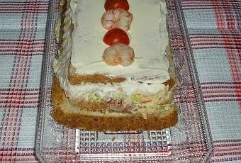 - Después desmoldamos el pastel, retiramos el film y cubrimos con mayonesa adornado con las gambas y las aceitunas que habíamos reservado.