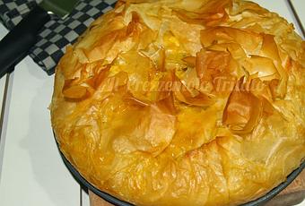 Para hacer la base de la pastela vamos a utilizar pasta filo para manejarla y que no se rompa ni se seque, vamos pintando cada hoja con mantequilla derretida. Engrasamos un molde de 24 cm. y vamos colocando las hojas en forma de abanico, ponemos el relleno dentro del molde y batimos los huevos y los ponemos encima del relleno, cerramos la masa hoja a hoja nos quedaran las puntas hacia arriba lo que dará textura a la masa. Horneamos durante 20 min. o hasta que la pasta este dorada. Sacamos la pastela del horno y dejamos enfriar y espolvoreamos con azúcar glass y canela.