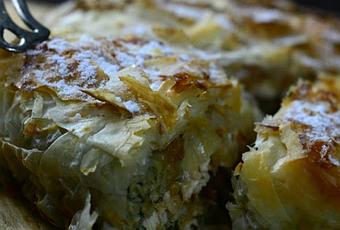 Con un pincel de cocina, pinta la base del molde con la mantequilla que has derretido en el microondas. Encima pones una hoja de pasta filo y pintas también, luego colocas el pollo desmenuzado, vuelve a poner una hoja de pasta filo encima, colocas sobre ésta, el revuelto , luego otra hoja, pintas y colocas la pasta de almendras, vuelve a poner otra hoja, pinta y cierra las hojas que sobresalen, siempre pintando con mantequilla. Mete al horno aproximadamente una media hora que veas que está dorado, de todas maneras, vigila que no se vaya a quemar.