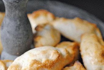 Estiramos la masa con un rodillo entre dos láminas de papel sulfurizado. Cortamos círculos con un cortapastas de 10 cms de diámetro y colocamos un poco de relleno en el interior de cada uno de ellos. Doblamos los lados hacia arriba y sellamos presionando con los dedos al tiempo que hacemos forma de zigzag.