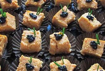 Desmoldamos en frío y cortamos en trozos iguales cuadrados. Los colocamos sobre cápsulas de papel rizado y adornamos a nuestro gusto, yo he adornado con caviarArtic y unas ramitas de cebollino.