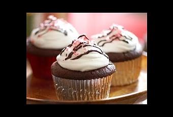 Precalienta el horno a 180°C. Pica 4 oz de chocolate y ponlos a un lado. Con una batidora, a velocidad lenta, bate la mezcla de pastel siguiendo las instrucciones de la caja donde necesitarás 3 huevos grandes, aceite vegetal y agua, pon la mezcla seca de pudín, los huevos, la crema agria, el aceite y el agua en un tazón grande solamente hasta que los ingredientes se humedezcan. Bate la mezcla a velocidad media por 2 min. más. Incorpora el chocolate picado y 2 cucharadas de dulces triturados. Coloca la mezcla dentro de 30 vasitos para muffin forrados con papel.