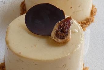 Sacamos del congelador los moldes y los ponemos sobre una rejilla y bañamos con el glaseado transparente. Dejamos escurrir el glaseado. Pasamos al plato de presentación y decoramos poniendo un higo seco, un círculo de chocolate encima de cada molde y por el contorno gofio frito.