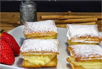 Ver el video de esta receta Los miguelitos son unos pastelillos típicos de la localidad albaceteña de La Roda hechos a base de fino hojaldre, rellenos de crema pastelera y espolvoreados con azúcar glasé.
