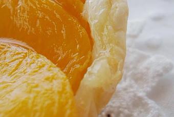 * Encendemos el horno a 200º para ir precalentando.* Cortamos nuestros melocotones en rodajas finas.