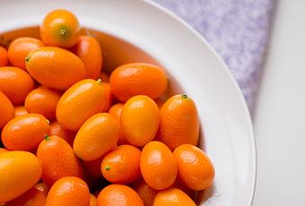 Los kumquats son unas frutas originarias de Japón y que se cultivan en el área mediterránea. Su sabor es dulce y acidulado, su piel es comestible y aromática y su pulpa amarilla y jugosa. Como es rico en pectina, es muy adecuado para hacer mermelada y también se utiliza para helados, tartas y compotas.