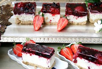- Coloca la gelatina con mucha suavidad encima de la crema de queso igualando la capa en altura.