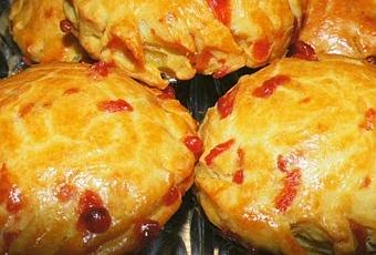 Este mes son unos pastelitos salados rellenos. La receta original es con jamón, pero yo como casi siempre la he tuneado con mortadela.
