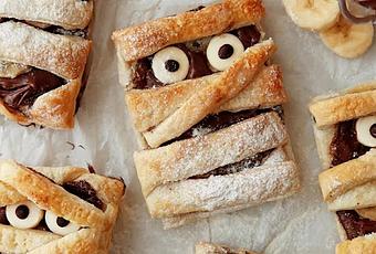 Una receta divertida y deliciosa para fiestas y meriendas — pastelitos rellenos de Nutella decorados como tiernas momias.