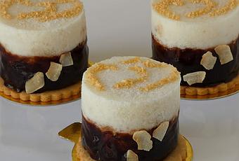 MontajeA cada uno de los bizcocho le ponemos una cinta de acetato alrededor sellando con una cinta adhesiva. Rellenamos cada uno con la crema de yogur de piña.Llevamos a la nevera 1 hora y luego al congelador.Cuando esté el glaseado espejo de cacao a unos 25ºC, sacamos del congelador los pastelitos, le quitamos la cinta de acetato y mojamos solo la parte de abajo del pastelito, hasta que cubra el bizcocho, colocamos encima de una galleta.Decoramos con coco seco rallado teñido de dorado y virutas de coco seco.