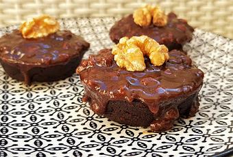 5. Vertemos encima de las magdalenas el chocolate y las dejamos enfriar en la nevera. Decoramos con nueces restantes y servimos.