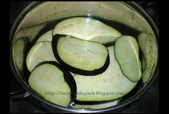 1. Pelamos las berenjenas, las cortamos en rodajas a lo largo y las colamos en un cuenco con agua y sal (para que boten el amargo)
