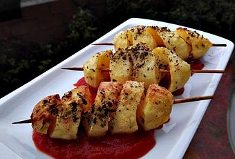Elaboración:La salsa bravaPicamos la cebolla en trocitos pequeños y las echamos en una sartén con un chorrito de aceite y dejamos pochar hasta que este doradita.Añadimos las dos cayenas y las dejamos unos minutos con la cebolla, la retiramos y le ponemos el pimentón sin que se nos queme, añadimos el tomate, una cucharadita de azúcar y la sal a nuestro gusto y dejamos cocinar lentamente.Pasados unos minutos retiramos la salsa y dejamos reposar.Las patatasPrecalentamos el horno a 180 grados y reservamos.Pelamos y lavamos las patatas, pinchamos las patatas de lado a lado y cortamos con un cuchillo en círculos, estiramos los trozos en los palillos de manera que queden en forma de espiral.Colocamos las patatas en la bandeja de horno con un chorrito de aceite cada una, y sal pimentamos por ambas caras.Hacemos un majado con los ajos, el perejil y aceite de oliva y le ponemos por encima a la patata, las metemos al horno y dejamos que se haga por una cara, a continuación les damos la vuelta y pintamos de nuevo con el majado.