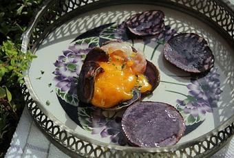 Patata Violeta, Huevo, Queso y Panceta: